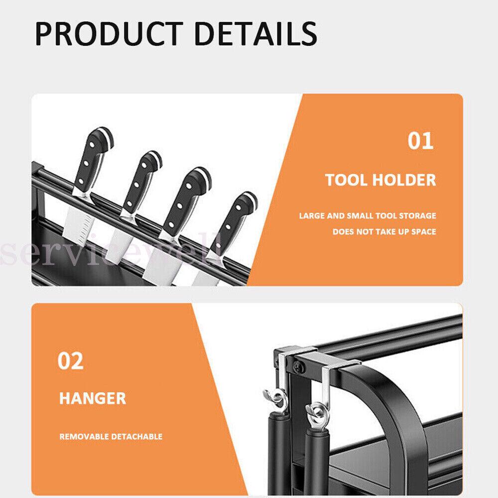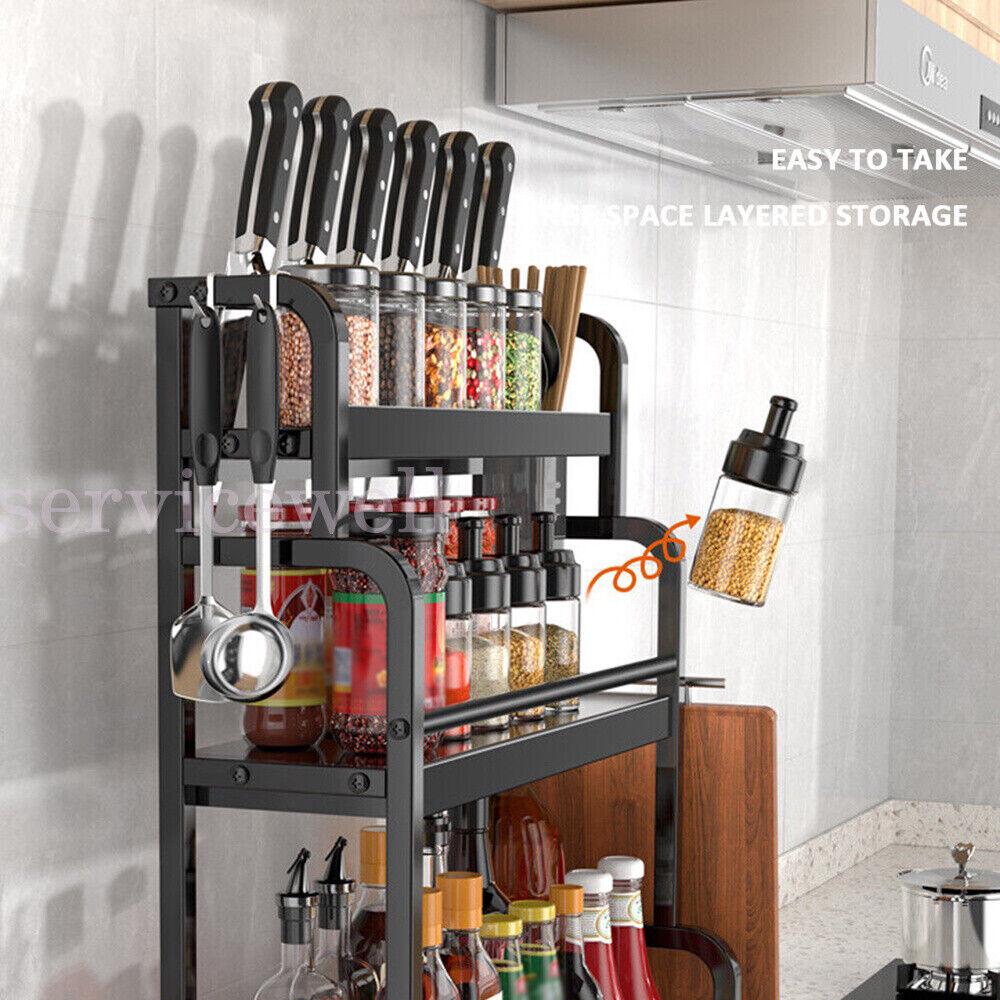 Multifunctional Storage: 3-layer spice rack with guardrail design to avoid dump, so that different size of bottles can be easily stored. Like cutting board rack, chopstick holder, and hook can be moved freely, which can easily solve the kitchen storage problem.
