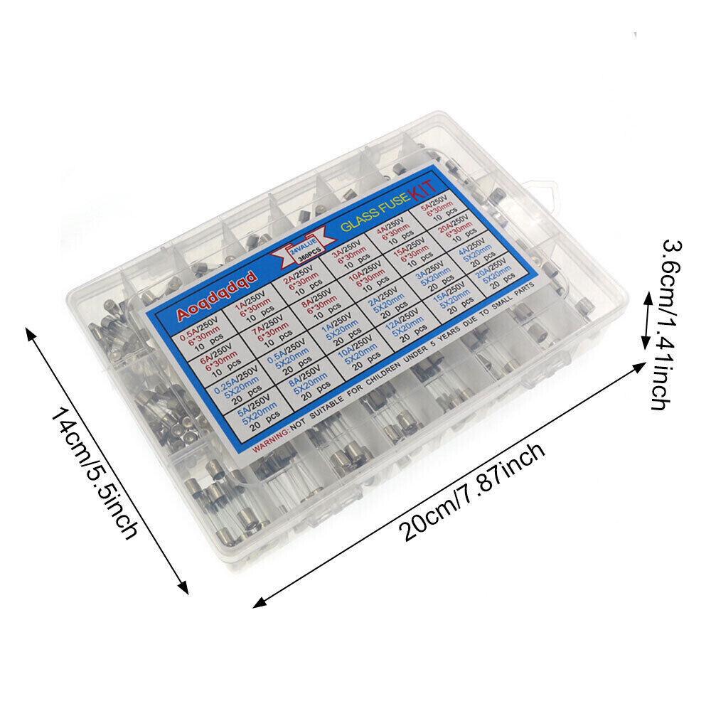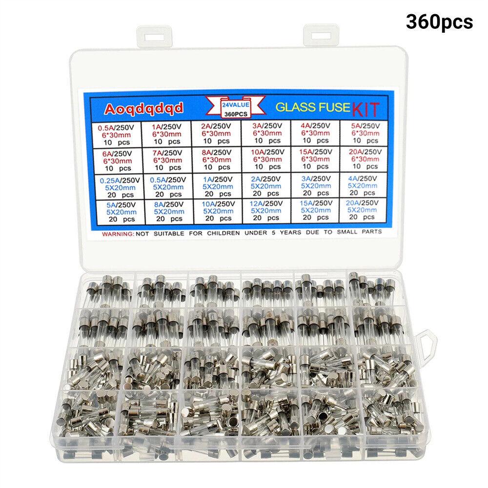 360X Glass Fuses 6x30mm 5x20mm Box Fuse Quick Blow Fast Acting Tube Assorted Kit