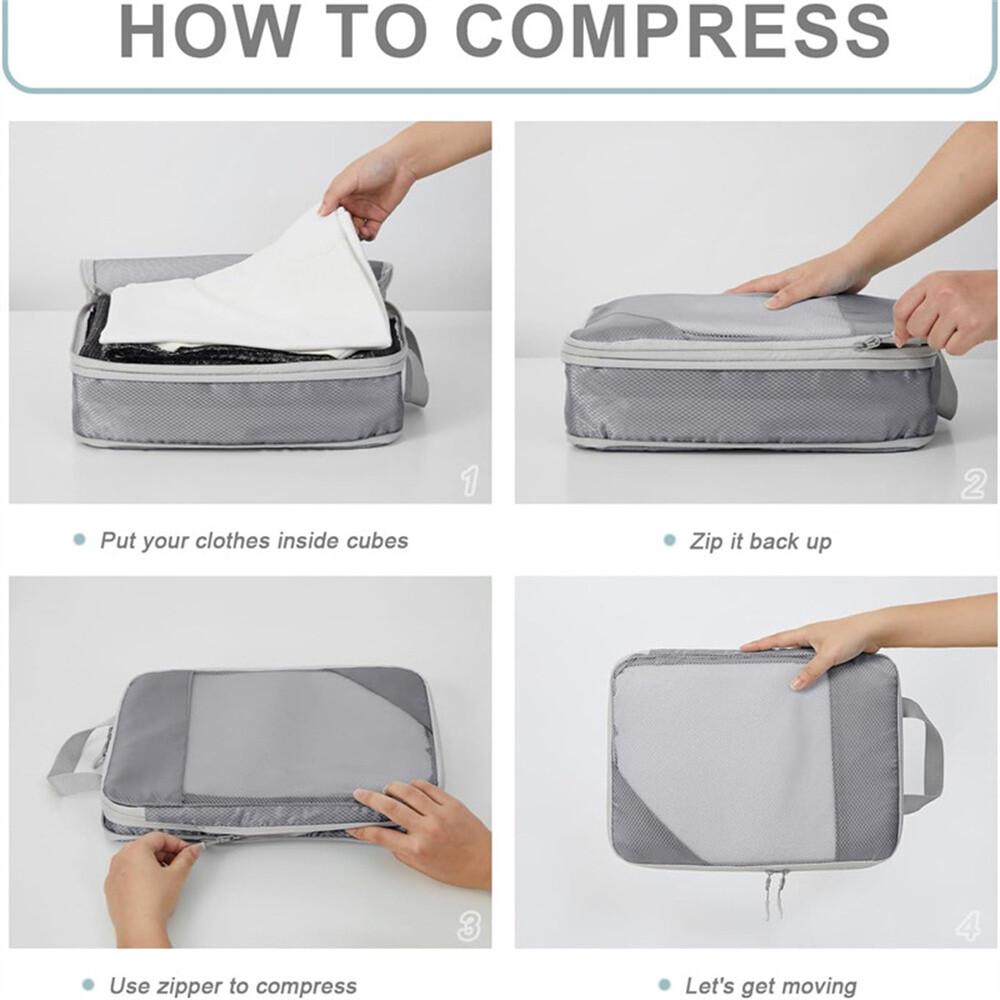 – Space Saving This compression travel cubes works a bit like a vacuum sealing machine. Adding an additional zipper on the outside can help remove excess air, flatten the clothes, and minimize the space inside. If you need to prepare multiple clothing choices for your trip, you no longer have to sacrifice style for luggage space when you encounter our packing cubes