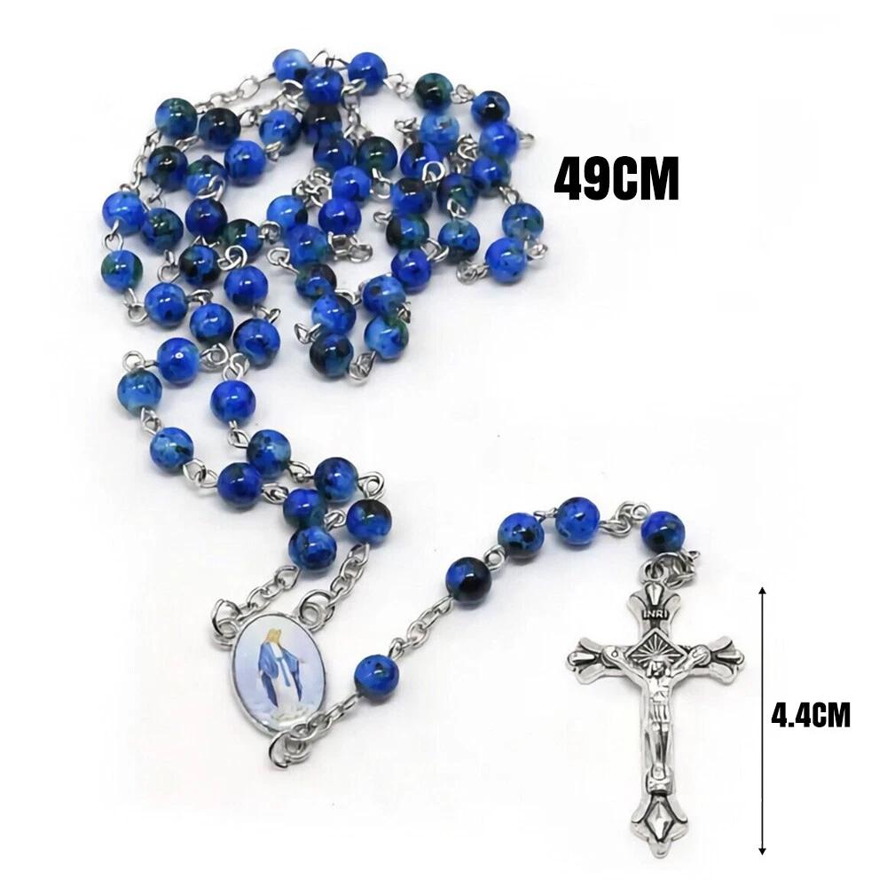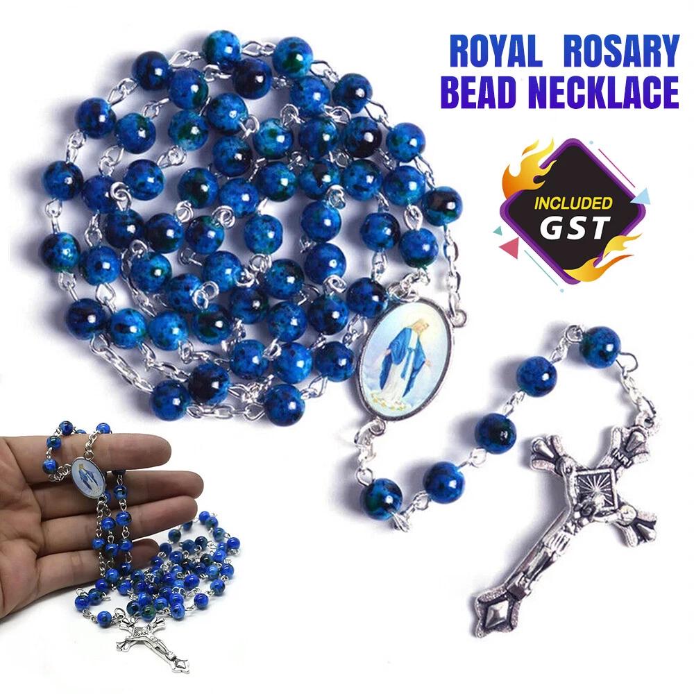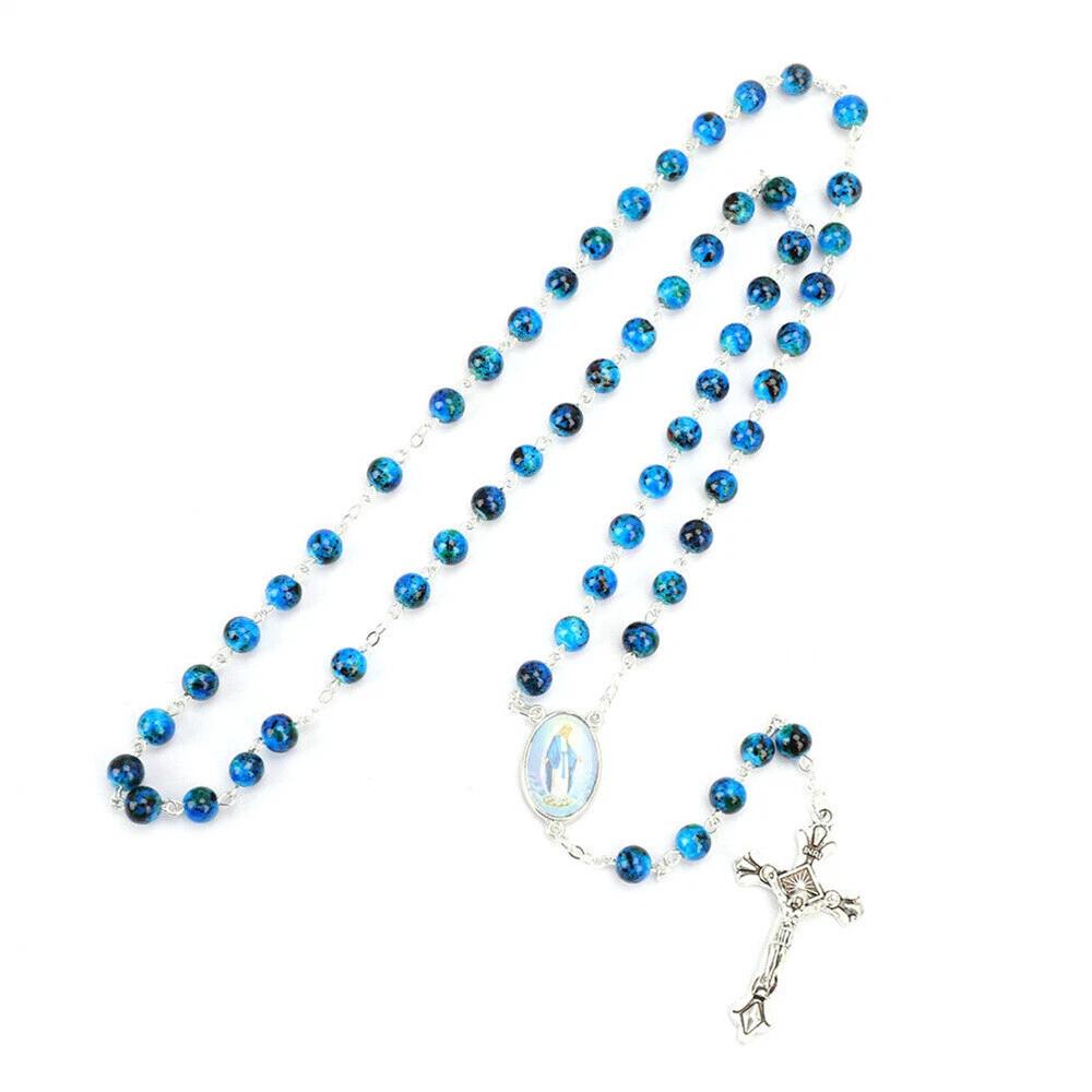 AU Rosary Beads Bead Blue Glass Necklace Crucifix Catholic Jesus Mary Catholic