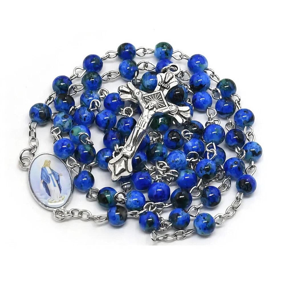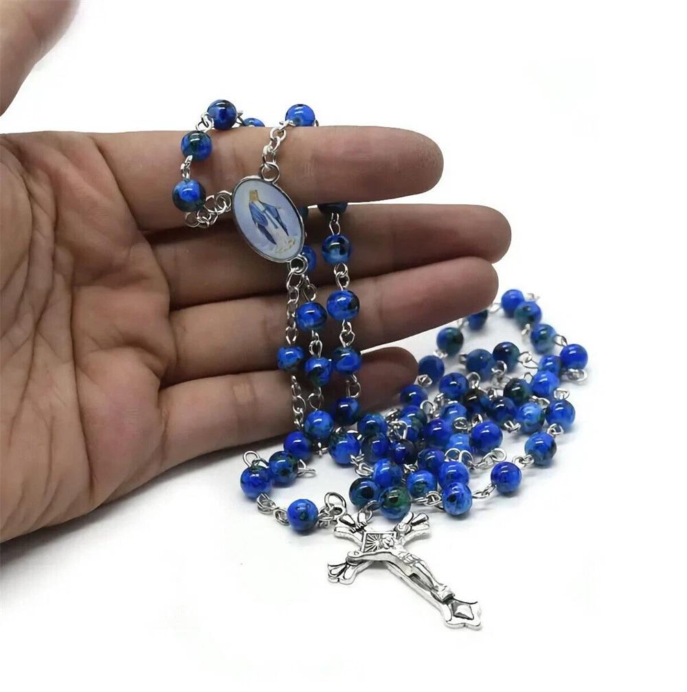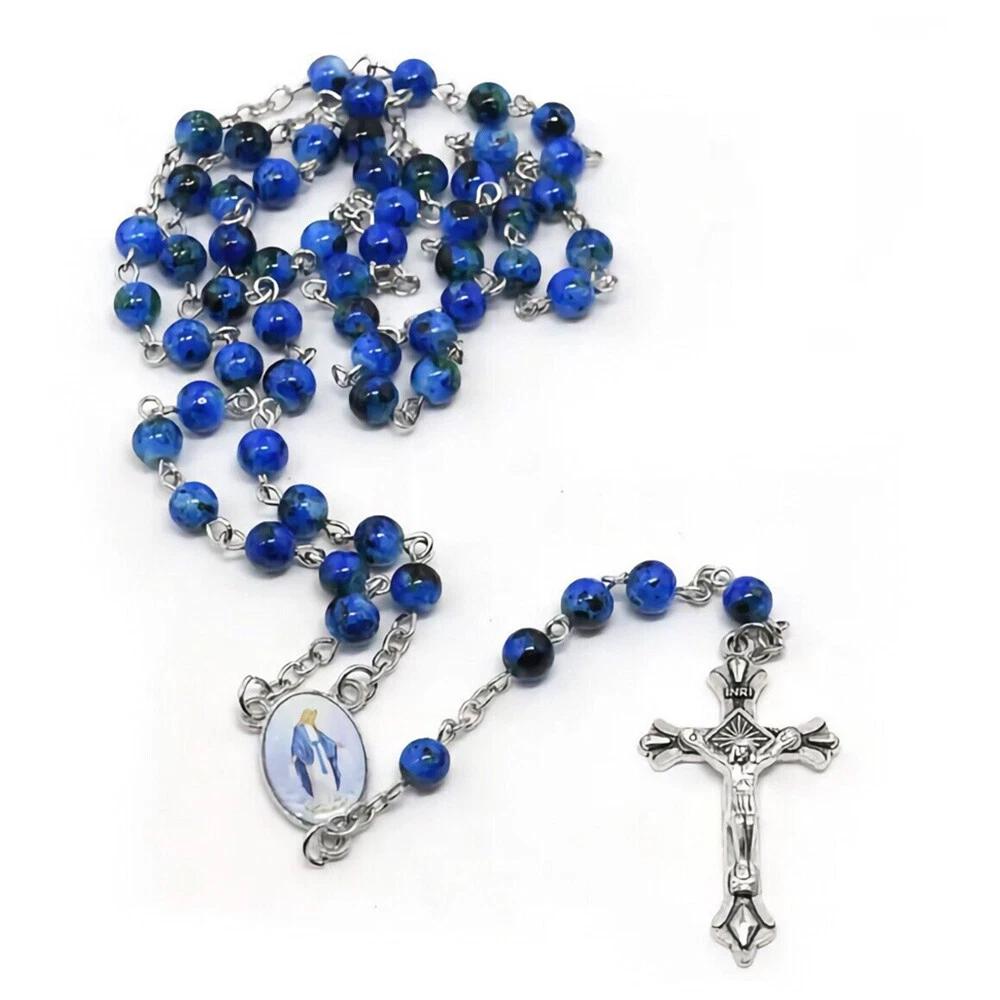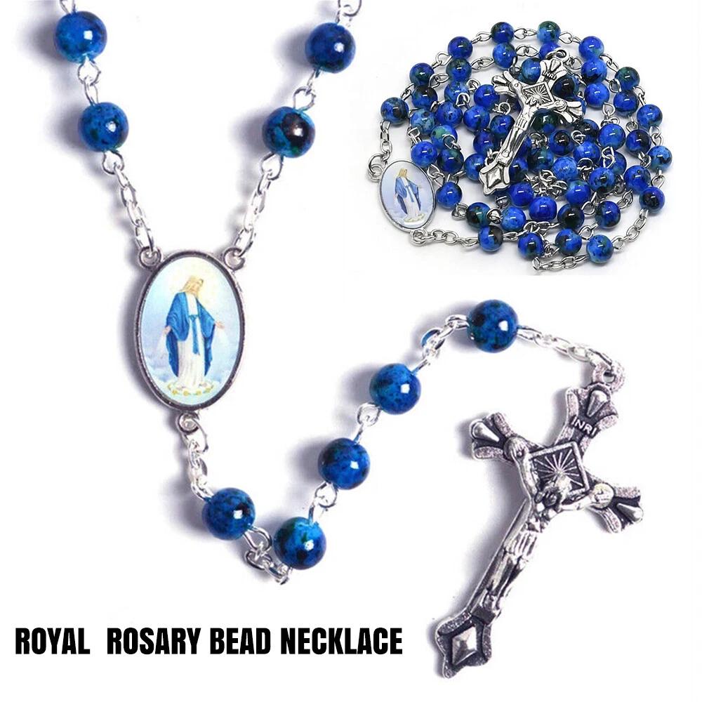 AU Rosary Beads Bead Blue Glass Necklace Crucifix Catholic Jesus Mary Catholic