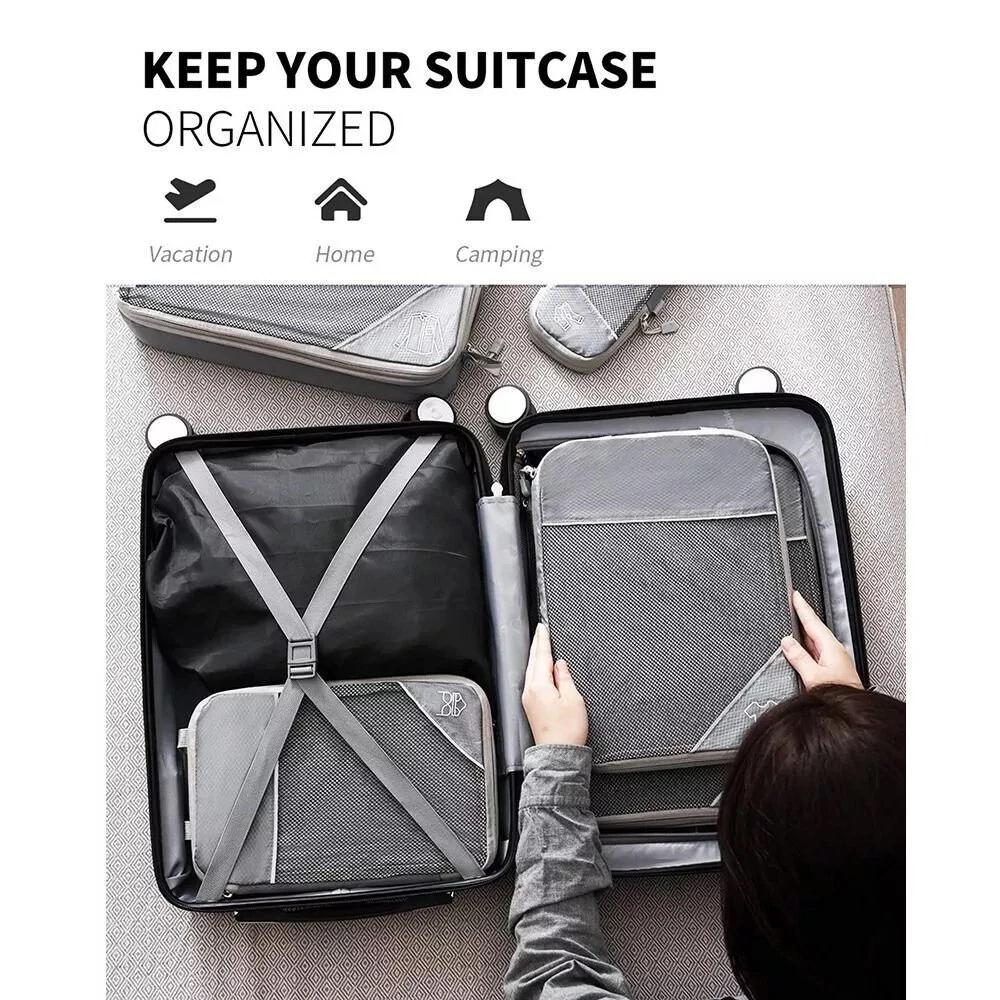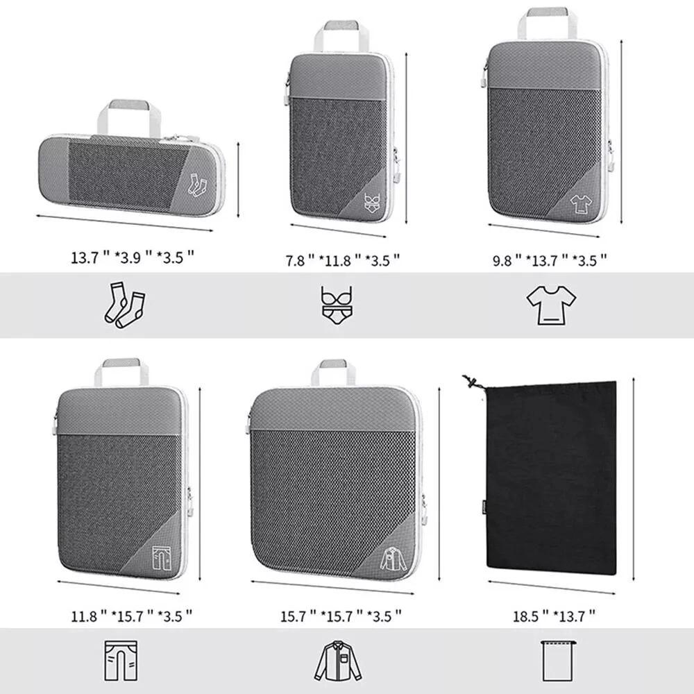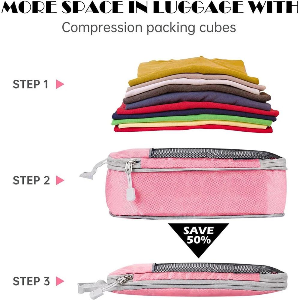 -[Saving 60% Space] These travel packing organizers help you pack clothes for upcoming trips by compressing the air out of them. How to compress First, fold or roll your clothes and pile them neatly; then, put them in the packing cubes and zip the normal zippers; finally, zip the compression zippers. Tips: you can put a finger on the back of the zippers in case the zipper gets stuck in fabric.