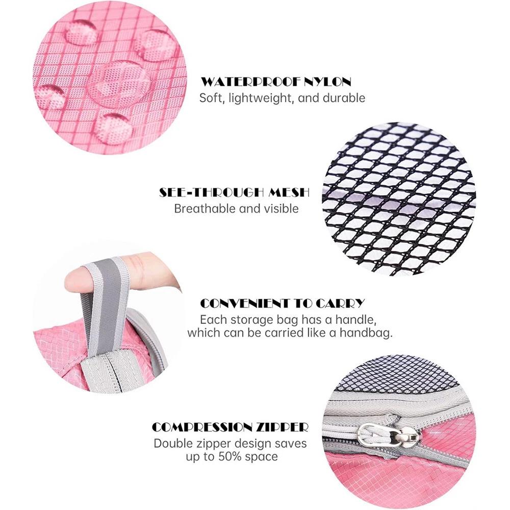 -[Heavy Duty Double Zippers] Equipped with compression zips, these organizers can save space up to 60% by compressing the packing cubes via the exterior heavy-duty double zippers. They help you carry more in the same suitcase or bag. The mesh of the cubes is reinforced with professionally double-done seams for ventilation and easy identification of contents.