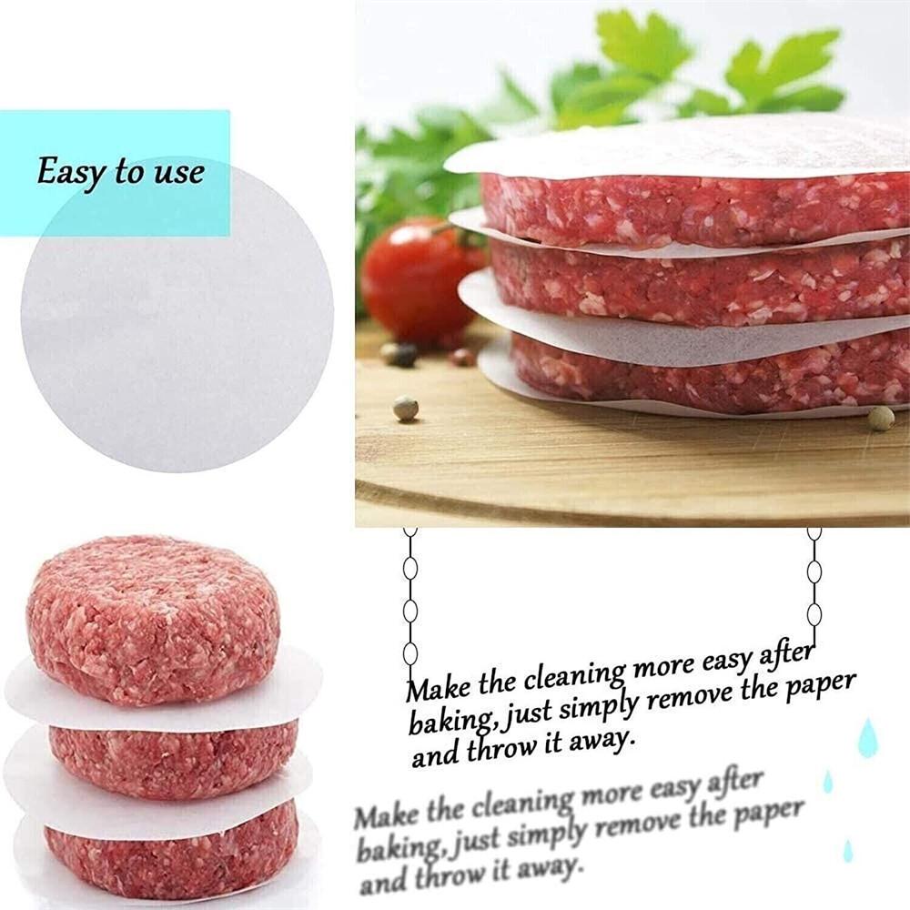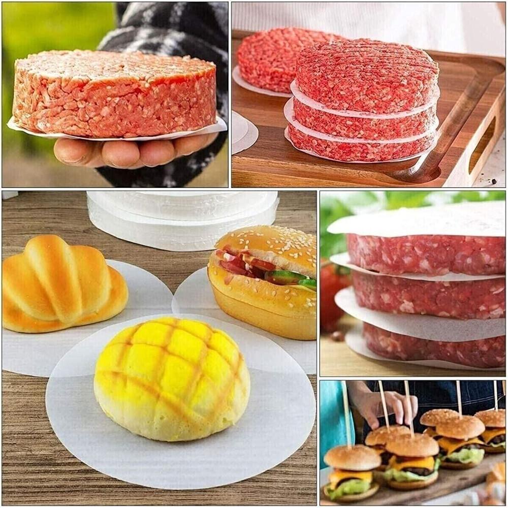MULTI-USE: The parchment papers are great for food baking, roasting, steaming for cakes, tarts, mousse, Perfectly fits to 4 in burger press, Also ideal to separating pressed patties, Avoid patties stick together and helping retain moisture and flavor while freezing