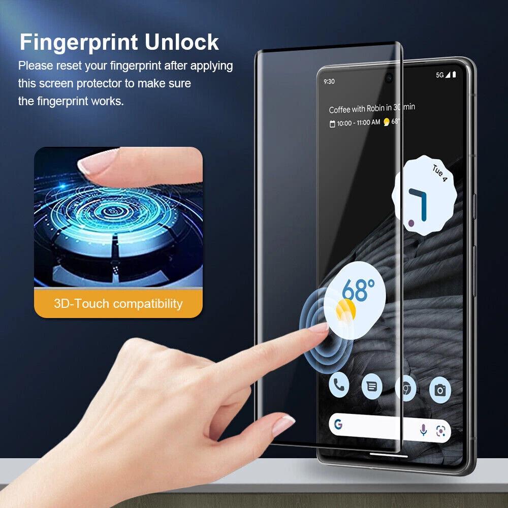 SUPPORT IN-SCREEN FINGERPRINT ID & DESIGNED FOR ULTRASONIC FINGERPRINT Tempered glass provides quick and smooth touch response. Sensitive performance delivers an original feeling to you. High touch sensitivity gives ” True Touch ” feel, ultrasonic screen fingerprint, which allows for high phone responsiveness. Designed for Google Pixel 7 / 7 Pro screen protector tempered glass fingerprint.