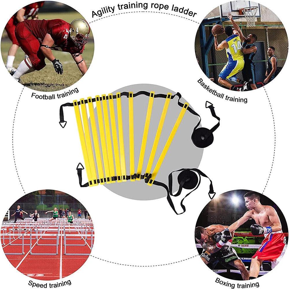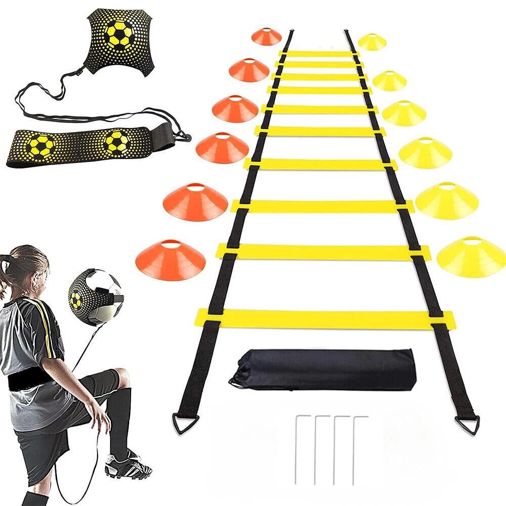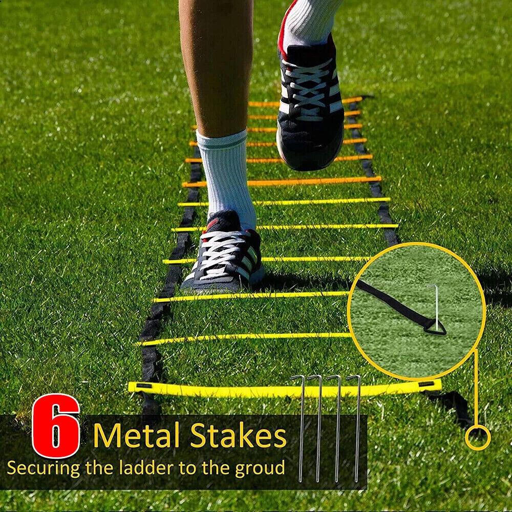 – Complete Sports Training Package Footwork exercises to improve football skills, this is a comprehensive football training tool. Each set includes a 6m agility ladder with 12 rungs, 12 football cones (6 yellow, 6 orange), 1 football kicking trainer, 4 steel stakes for added stability and a carry bag.