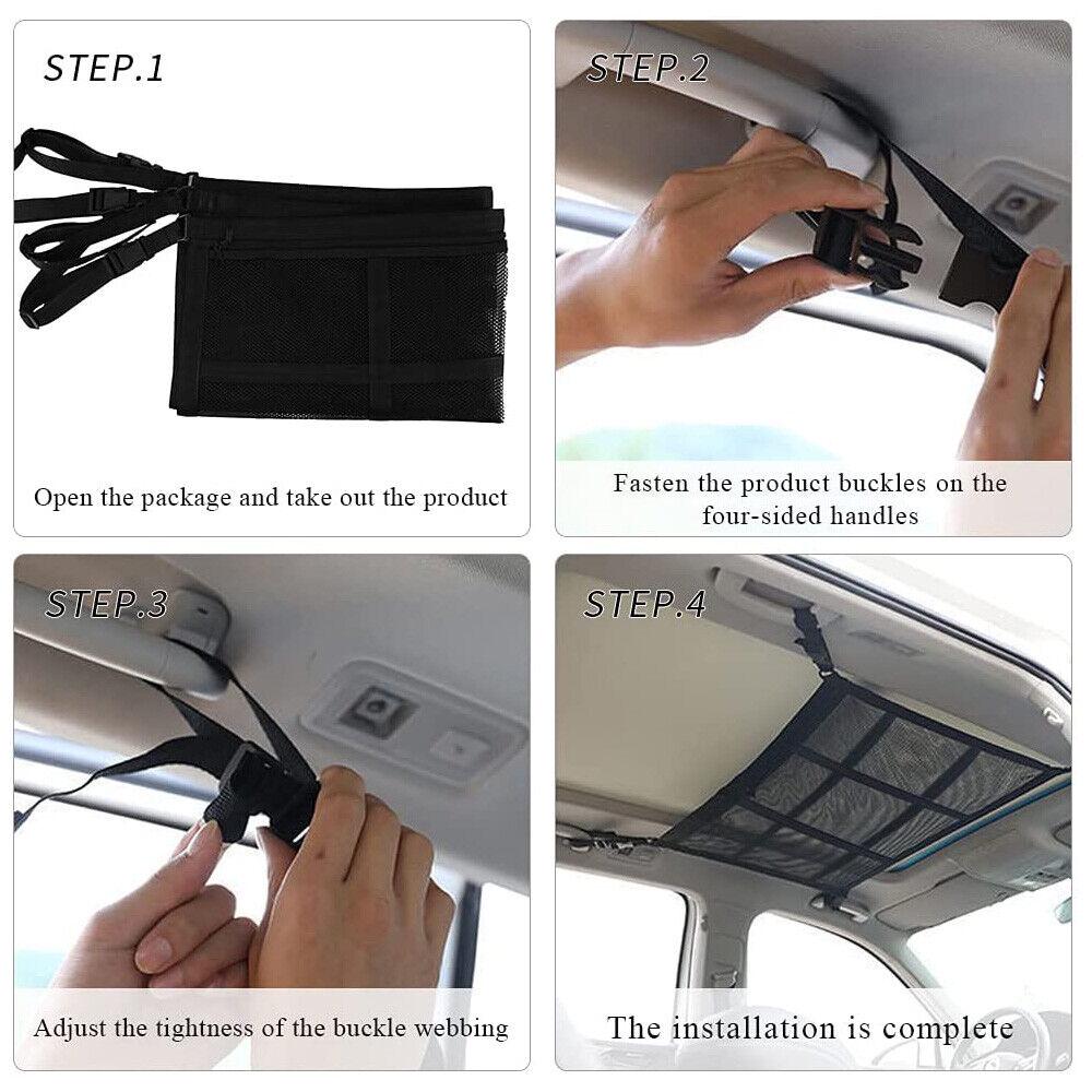 3 Easy to Install: The cargo net bag has four strong nylon elastic belt fixing buckles, tightening device to fix the car storage organizer. First use 4 belts to connect to the 4 roof handles, buckle your buttons, and then adjust the belts according to your parking space. You are ready to store your things! Rugged and safe, it takes up less space.